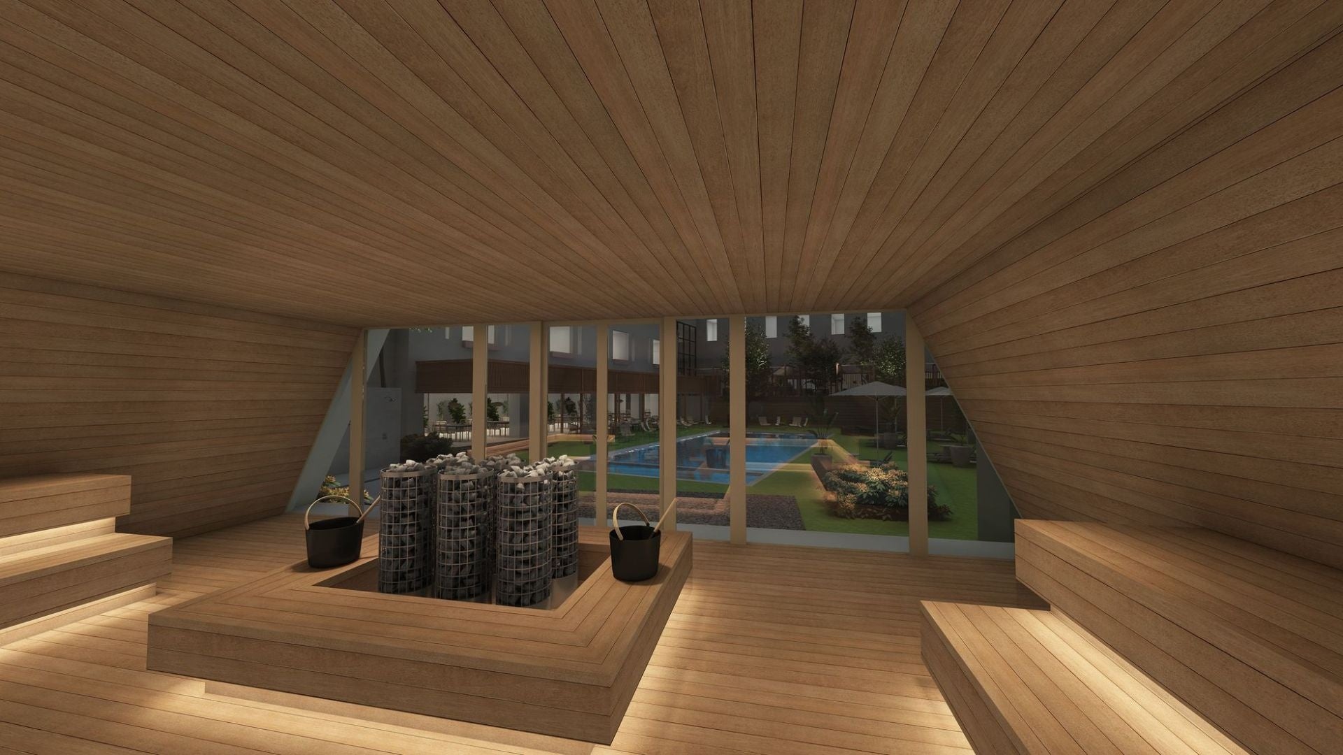 アイコニックな三角屋根のチャペルを、広い空間のフィンランドサウナとして利活用。サウナは水着着用で利用でき、セルフロウリュも可能。非日常感のある空間で、恋人同士・友人同士でお喋りを最大限お楽しみいただけることを最優先に設計しており、サウナ初心者やサウナ未経験者の利用を目指します。