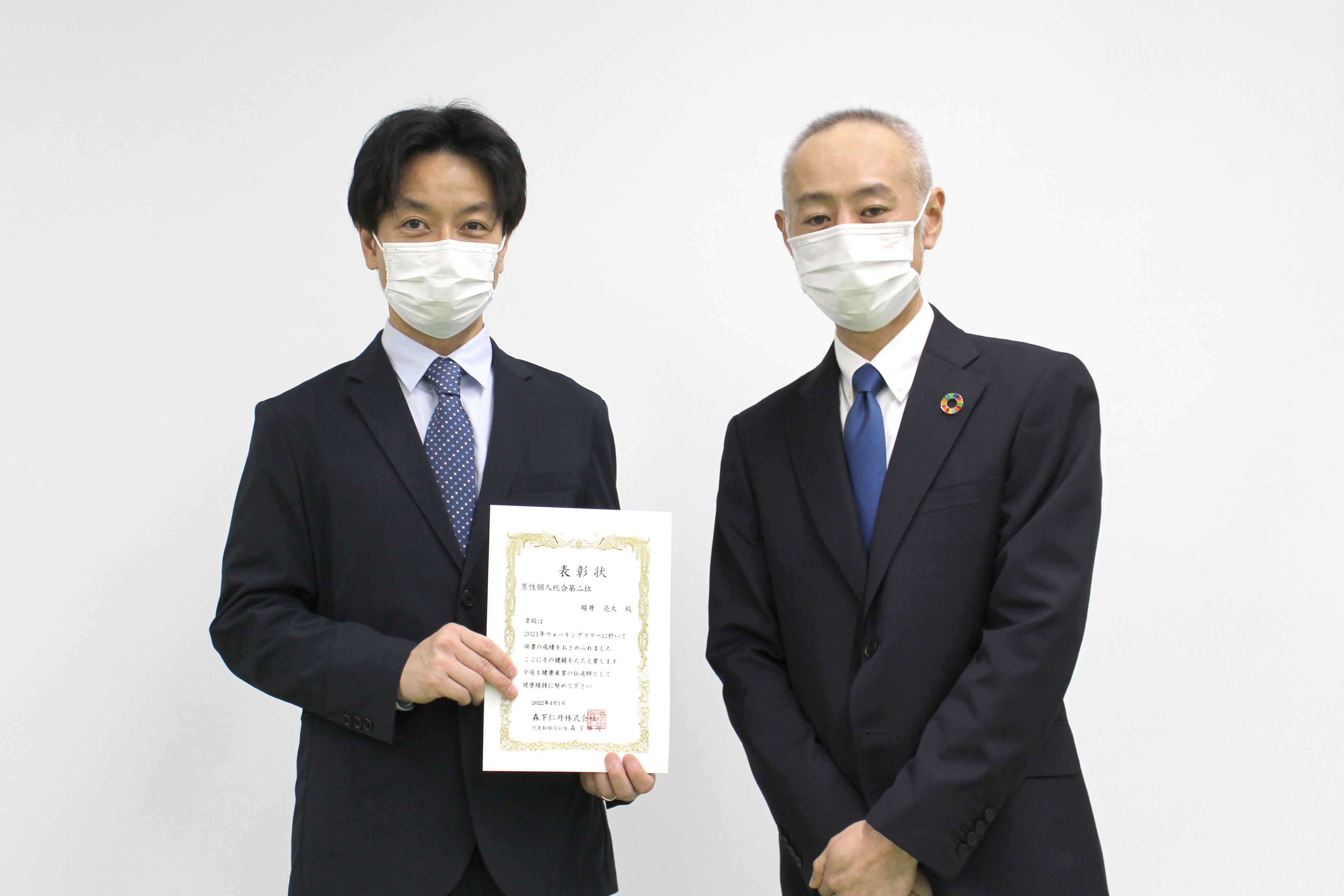 全従業員参加型のウォーキングラリーは当社の健康経営における取り組みのなかでも歴史が長く、2021年度で13年目となるイベントです。歩数達成者への表彰のみならず、昨年度は新たに社長が独自に審査し表彰する「フォトジェニック賞」を設け、ウォーキングに取り組む自らの様子をアピールできる仕組みを作り、参加促進とイベントの活性化を図りました。各賞の表彰は全社朝礼で行われました。