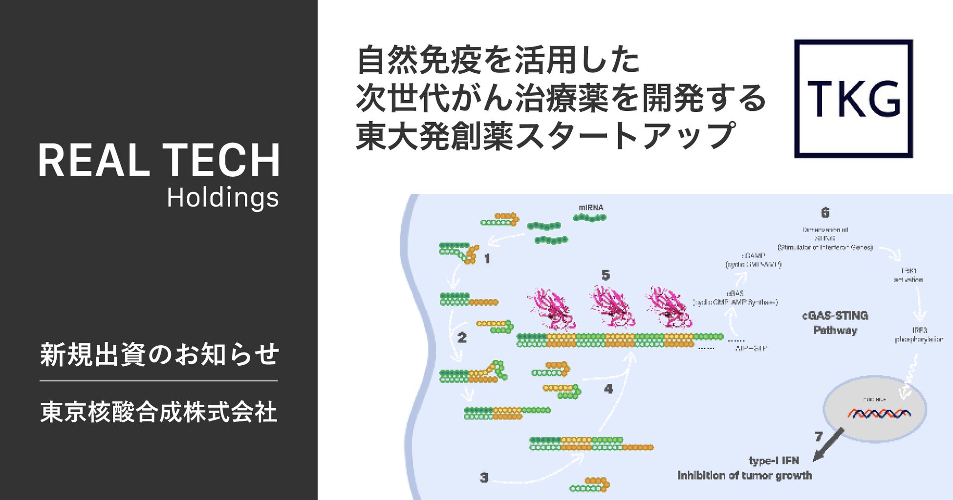 リアルテックホールディングス株式会社(所在地:東京都墨田区、代表:丸幸弘、永田 暁彦)が運営するリアルテックファンド*は、次世代がん治療薬を開発する東京大学発創薬スタートアップである東京核酸合成株式会社(本社:東京都文京区、代表取締役社長:松井雅章、以下「東京核酸合成」)へ投資を実施したことをお知らせ致します。東京核酸合成は今回の調達資金をもとに、新規モダリティである核酸集合を用いた核酸医薬品の開発と核酸の効率合成機の開発を進め、未だに治療法のない疾患に対する治療薬の開発を通じ「技術の力で治療はもっと良くなる」の実現を目指します。