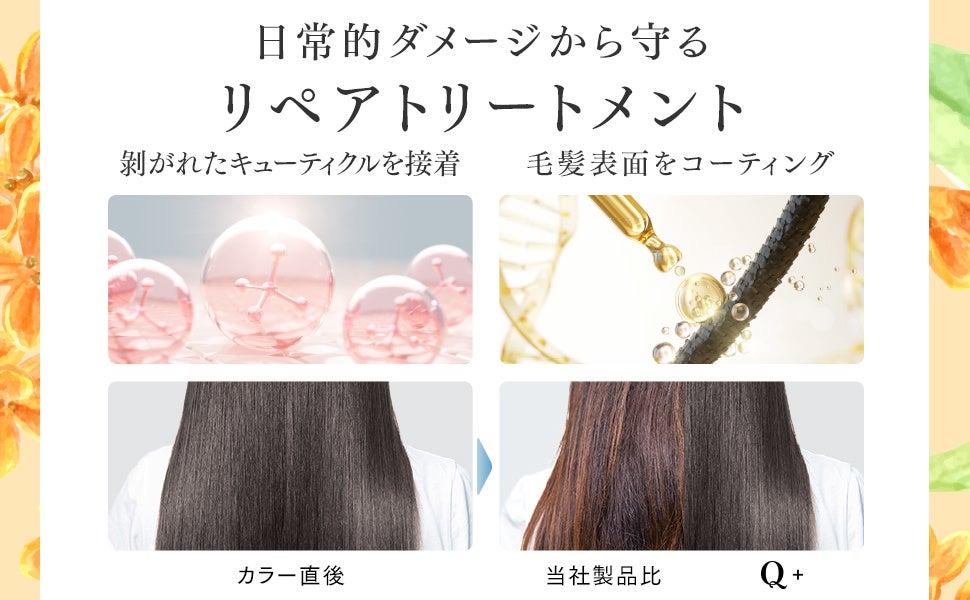 剥がれたキューティクルを接着し、毛髪表面をコーティング保護することで、いつまで美しい髪色をキープ*します。