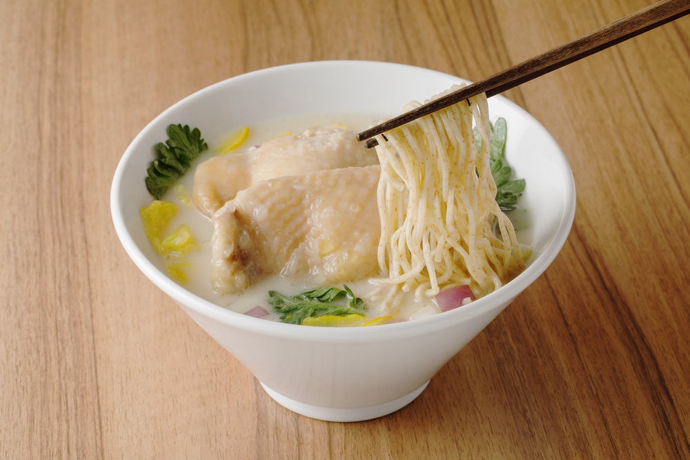 昆布から丁寧にとった出汁に鳥スープを調合し、鶏骨が煮崩れるまで弱火で長時間炊いたスープです。