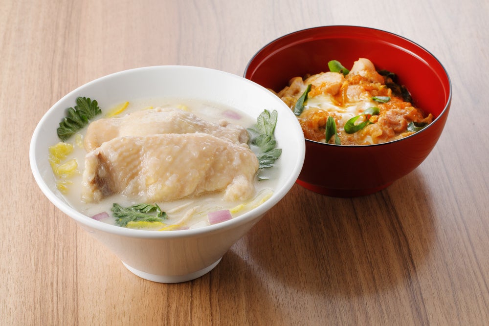 『HACHIKI』のこだわりがすべて詰まった京の鶏 水炊きSOBAと、全国の八起庵で大人気の全国丼グランプリで金賞を受賞しているミニ親子丼のセットです。