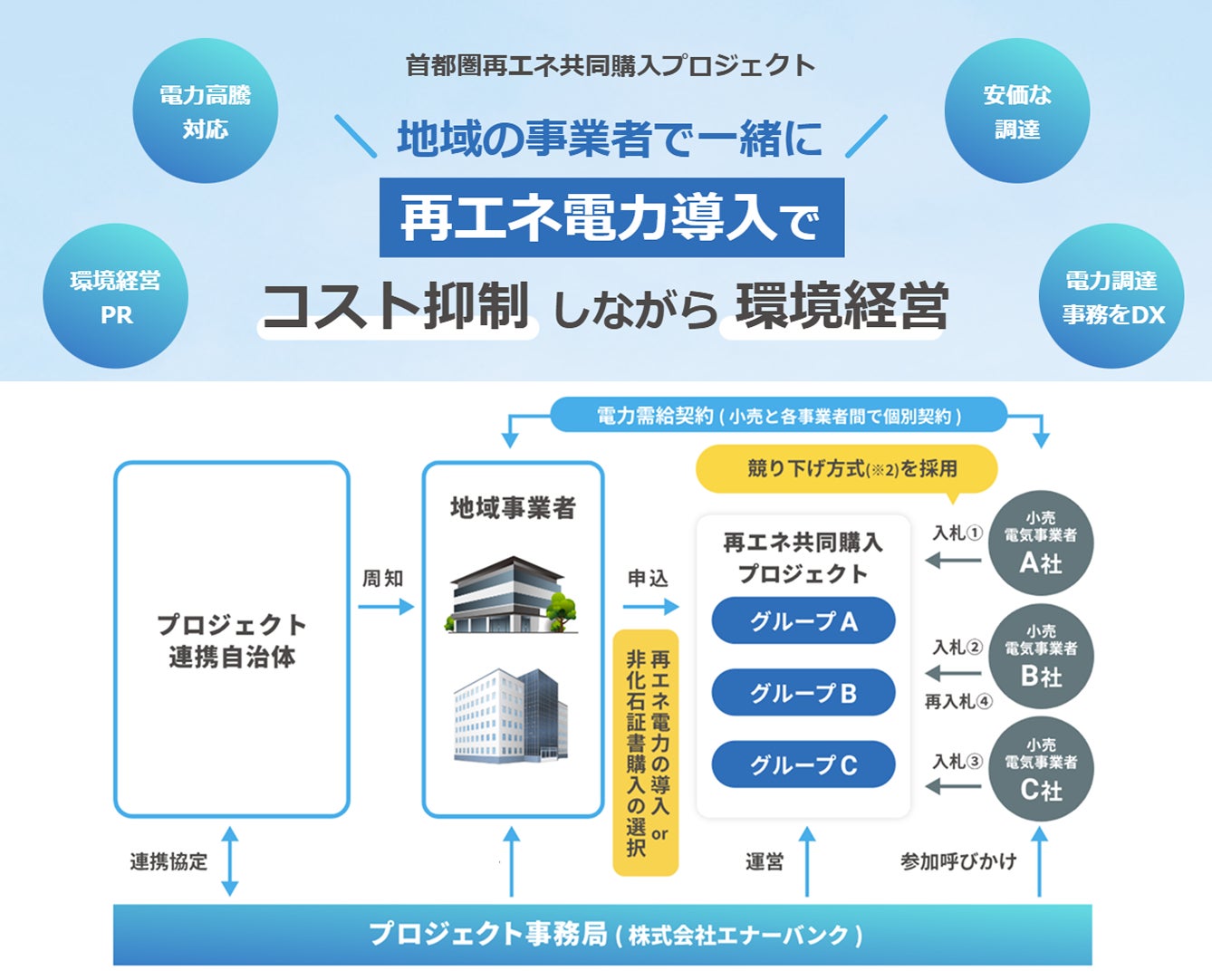 エナーバンクが実施する首都圏再エネ共同購入プロジェクトを活用し、再エネ電力の購入価格を抑えることで、九都県市内の事業者における再エネ電力の利用を促進し、脱炭素社会の実現を目指します。