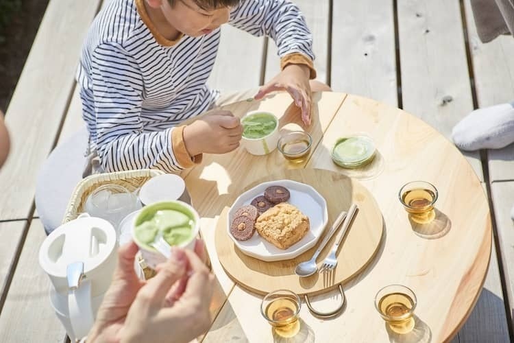 テラス近くには、お菓子屋カフェやパン屋がいろいろ。お気に入りの食べ物を持ち込めば、茶畑ピクニックがより楽しく。