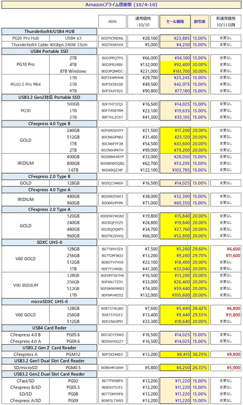 また、SDXC UHS-II V60 GOLDカード、microSDXC UHS-II V60 GOLDカード、一部のカードリーダーは、セール終了後10月11日に通常価格を値下げします。
