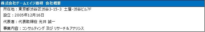 株式会社ゲームエイジ総研(代表取締役社長:光井誠一)では、「ゲームビジネスに特化したマーケティングリサーチ&コンサルティングファーム」として様々な分析を行っています。