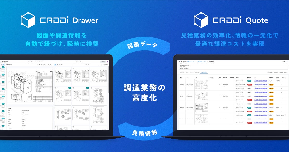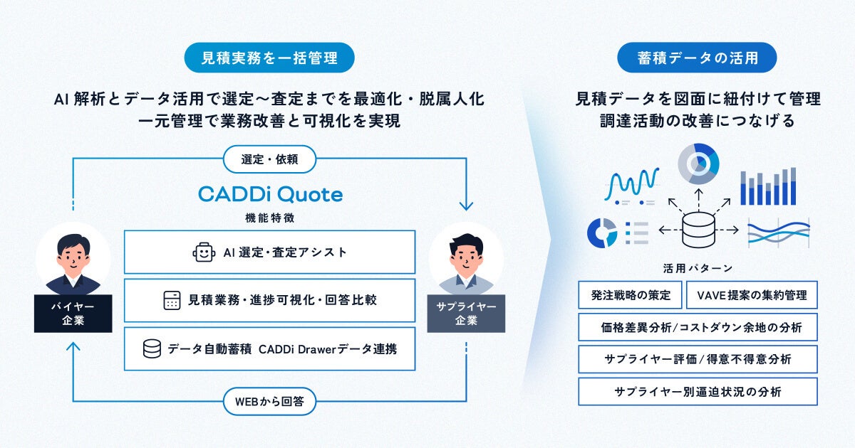 エンジニアリングチェーン・サプライチェーン上のあらゆるデータを解析・関連付けし、インサイトを抽出することで、人間の生産活動をより楽に、かつ高度化する「製造業のAIデータプラットフォームCADDi 」において、調達向け第一弾アプリケーションとなるAI見積クラウド CADDi Quoteは、見積情報をベースとしたサプライチェーンのデータを蓄積していくことで、購買価格の設定・査定やサプライヤー選定をデータドリブンで行える仕組みに変えていくことを目指します。