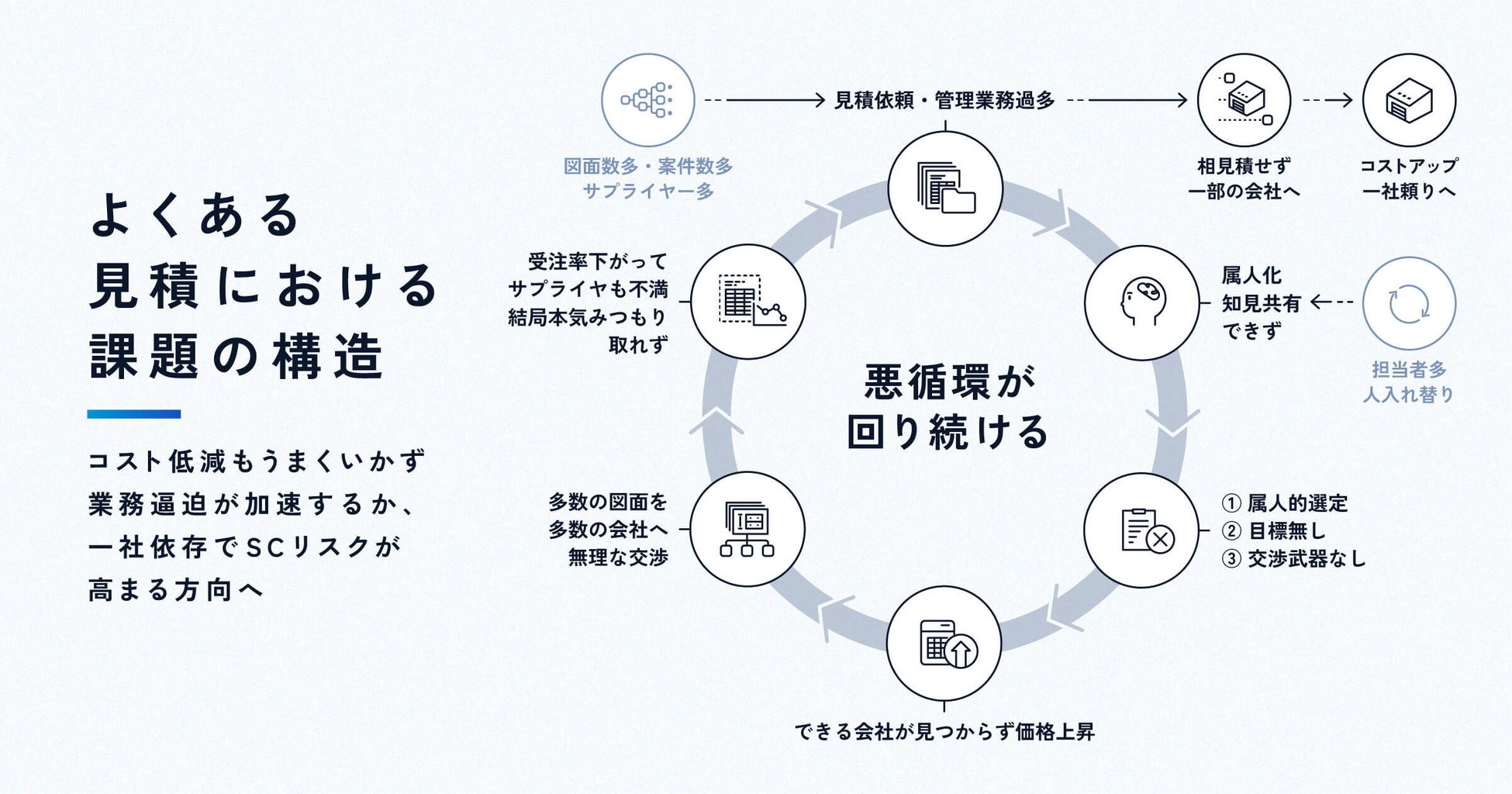 多くの製造業において、見積業務はメール・エクセル・FAXなどの方法で行われ、大量の時間を消費し、属人化しています。結果として、見積もりや調達活動のノウハウや知見がベテランに依存する形となり、改善が進まず、日々の業務に追われることでこの属人化がさらに加速するという悪循環に陥ってしまっています。