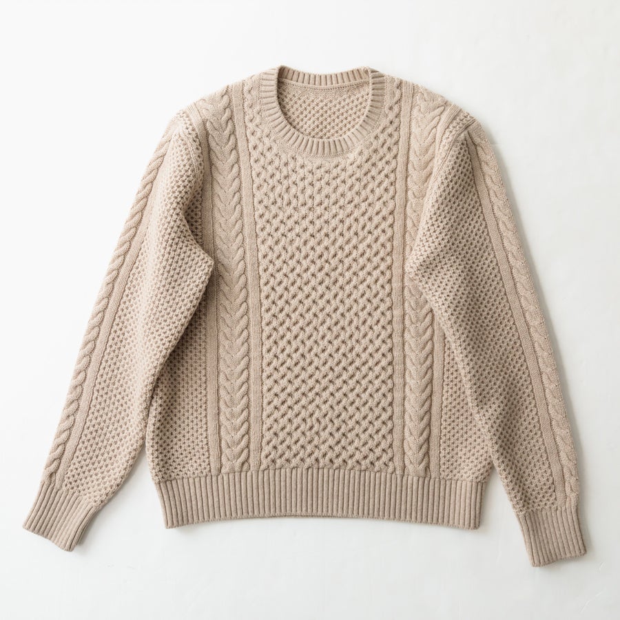 今回の「ウォッシャブルウール100% 軽量ケーブル編みニット」には、4種類の柄をあしらい、派手すぎず落ち着きすぎない絶妙なバランスに。