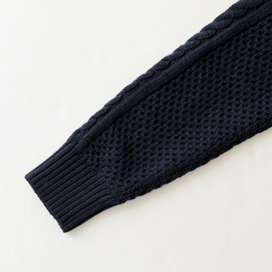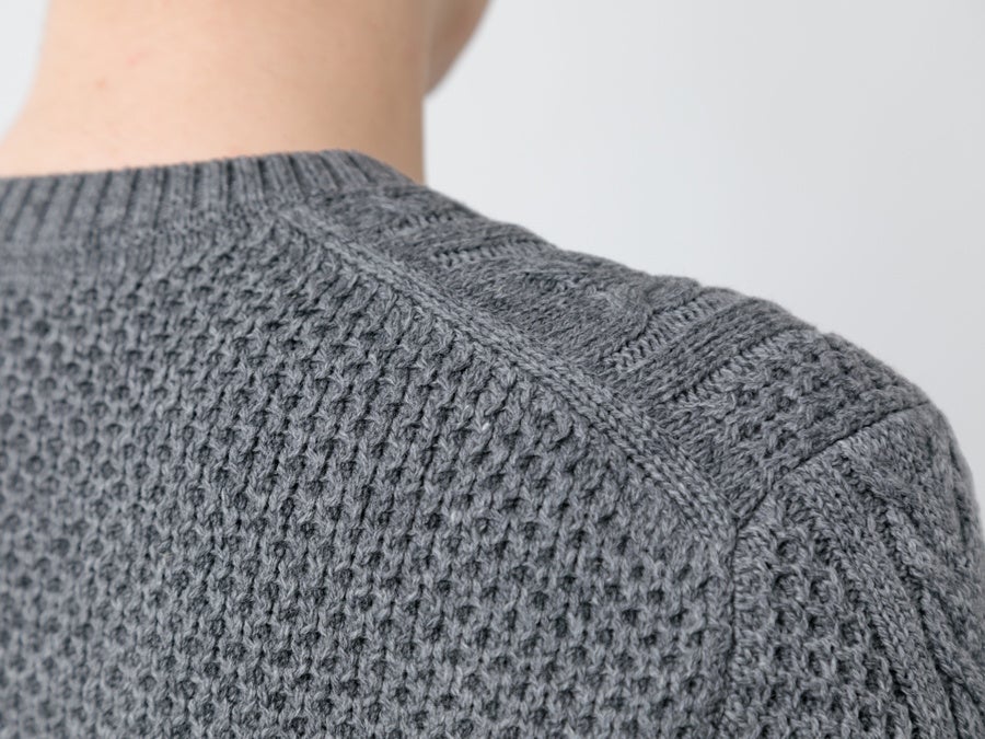 今回のニットは、新潟県五泉市のニット工場・川島の職人の経験値によって、上品な印象のケーブル編みに仕上がりました。