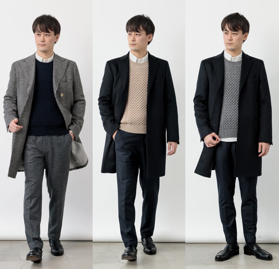 ②コーデも様々。分厚すぎないからシャツとの重ね着も決まる