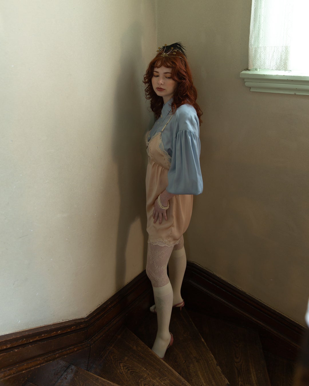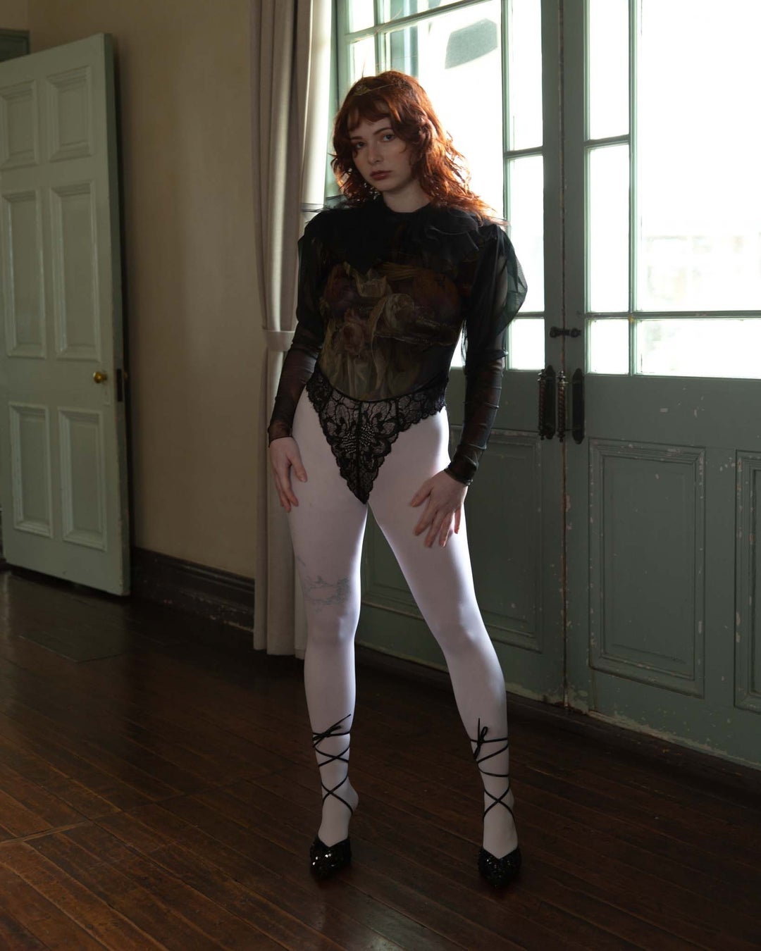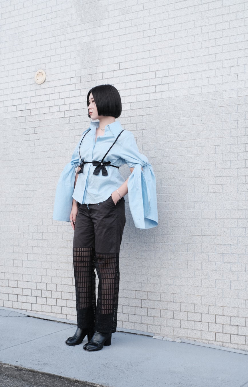ガーターベルトが一体化され身体をデザインするように描かれた「シアーシャツ」や、スタイリングのアクセントとなるリボンモチーフの「ブラハーネス」も限定販売。