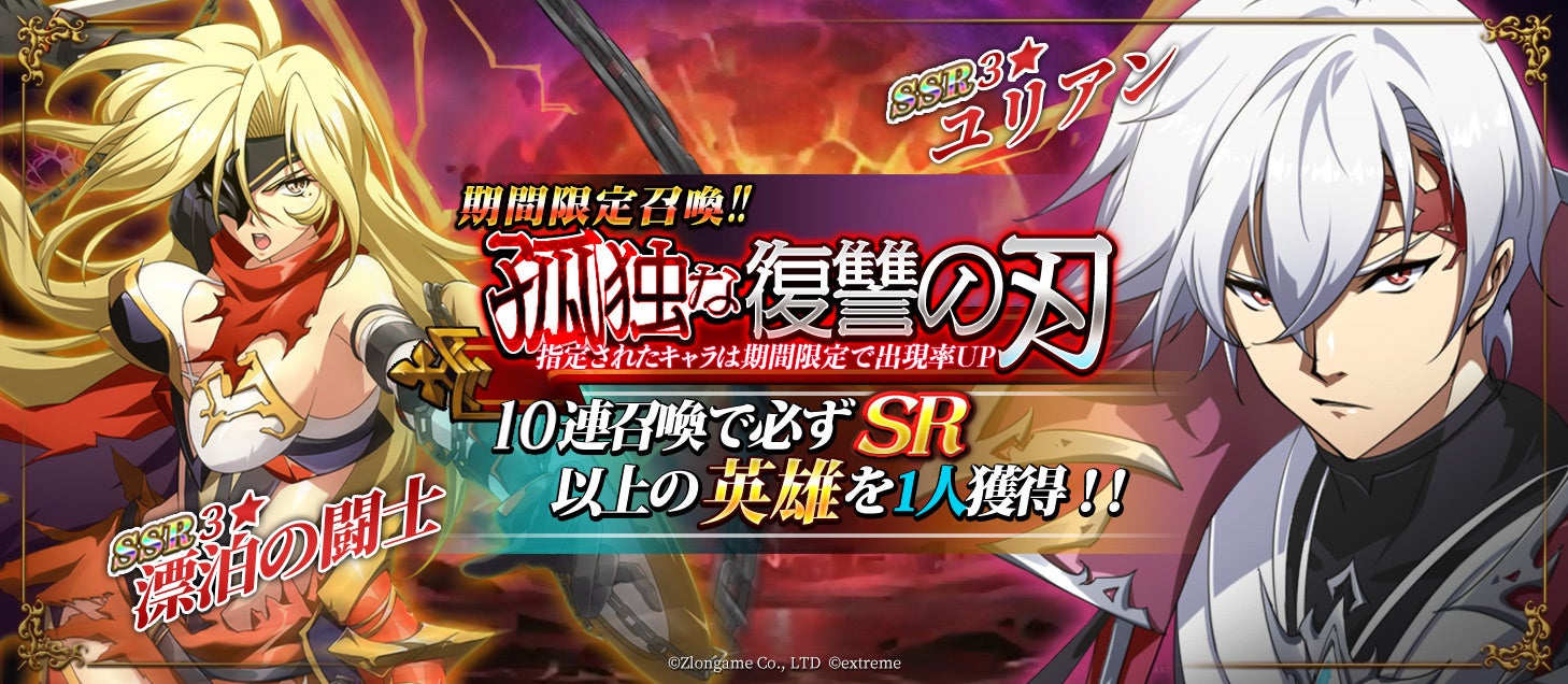 『孤独な復讐の刃』は10連召喚で必ずSR以上の英雄を一人獲得できる、期間限定召喚です。SSR漂泊の闘士、SSRユリアンの出現確率が期間限定でアップします。