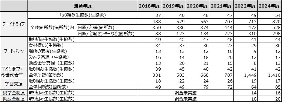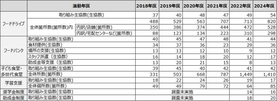 活動別にみると、子ども食堂・多世代食堂で1生協、フードドライブで5生協、フードバンクで3生協と、支援に関わる生協数はいずれも増加し、学習支援に関わる生協数は前回調査から2生協減少しました。奨学金制度をもつ生協数、助成金制度をもつ生協数はともに、前回調査と比べて2生協増えています。