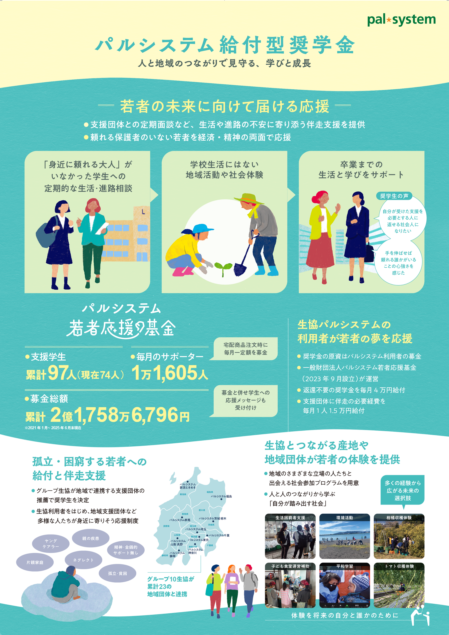 組合員からの募金を原資に、経済的困難を抱える学生を支援する「パルシステム給付型奨学金(若者応援基金)」に取り組んでいます。2020年の制度創設以来、累計97人に給付を行っており、2024年度までの募金総額は2億円を超えています。本制度は、毎月4万円の給付を行うだけでなく、地域団体と連携した生活相談などの「伴走型支援」や、産直産地での農業体験・ボランティアといった「社会体験プログラム」を提供している点が特徴です。単なる資金援助にとどまらず、貧困家庭の課題である「社会との接点の少なさ」に対し、学生に寄り添いながら多様なつながりや体験の機会をつくり出しています。こうした経済支援を超えた細やかなサポートの仕組みや、事業の持続可能性が高く評価され、2025年10月に「2025年度グッドデザイン賞」を受賞しました。