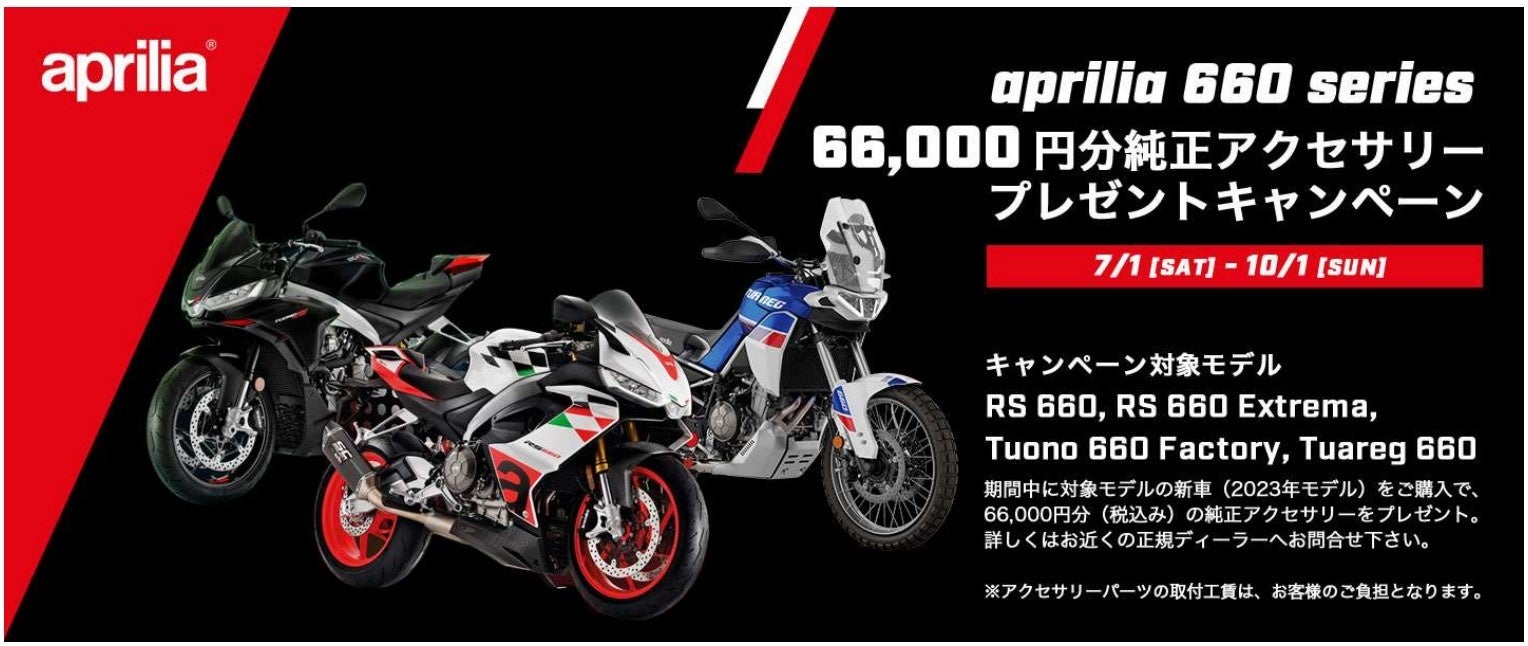 最先端の電子制御テクノロジーを装備し、洗練されたデザインと軽量でパワフルなミドルスポーツ『RS 660 シリーズ』と、その車体をアップハンドル仕様にし、ストリートでも楽しめるライトウェイトスポーツ『Tuono 660 Factory』、そして卓越したパワーウェイトレシオと優れたオフロード性能を誇り、オンロードでも高い快適さを実現したミドルアドベンチャーバイク『Tuareg 660』 の新車をキャンペーン期間中に購入されたお客様に、快適性や利便性を向上させる純正アクセサリー66,000 円(税込)分をプレゼントし、アプリリアのミドルスポーツレンジのライディングをさらに魅力的にするキャンペーンです。