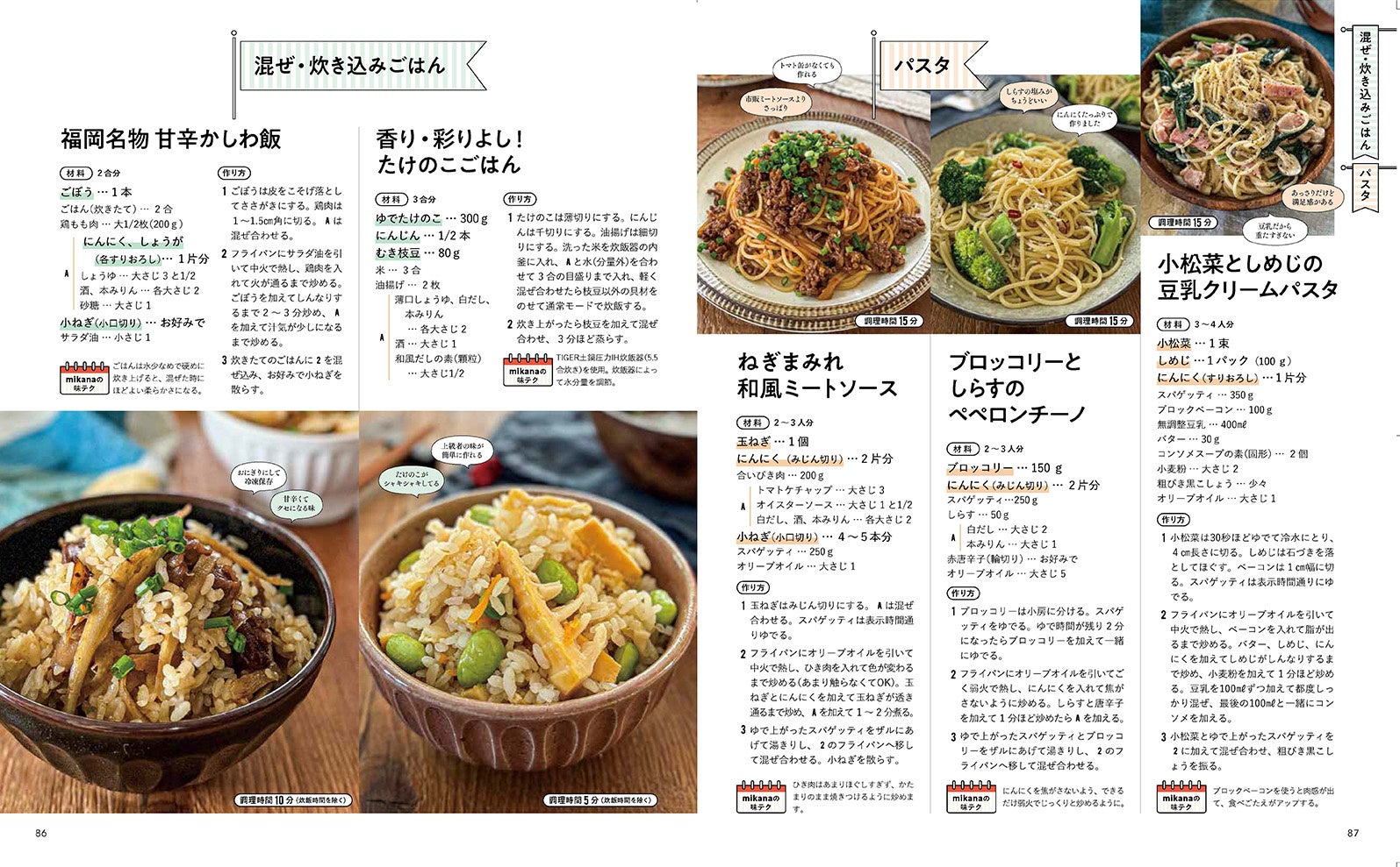 このレシピ本では、mikanaさんイチオシのレシピが野菜ごとに紹介されているので、家にある食材で作れるレシピをすぐに見つけることができます。冷蔵庫にキャベツがあれば、ガッツリ食べたいときには「キャベツと鶏むねのちゃんちゃん焼き」、もう一品ほしいときには「キャベツとカリカリじゃこのやみつきサラダ」など、数あるレシピの中からそのときの気分で選ぶことができて便利です。