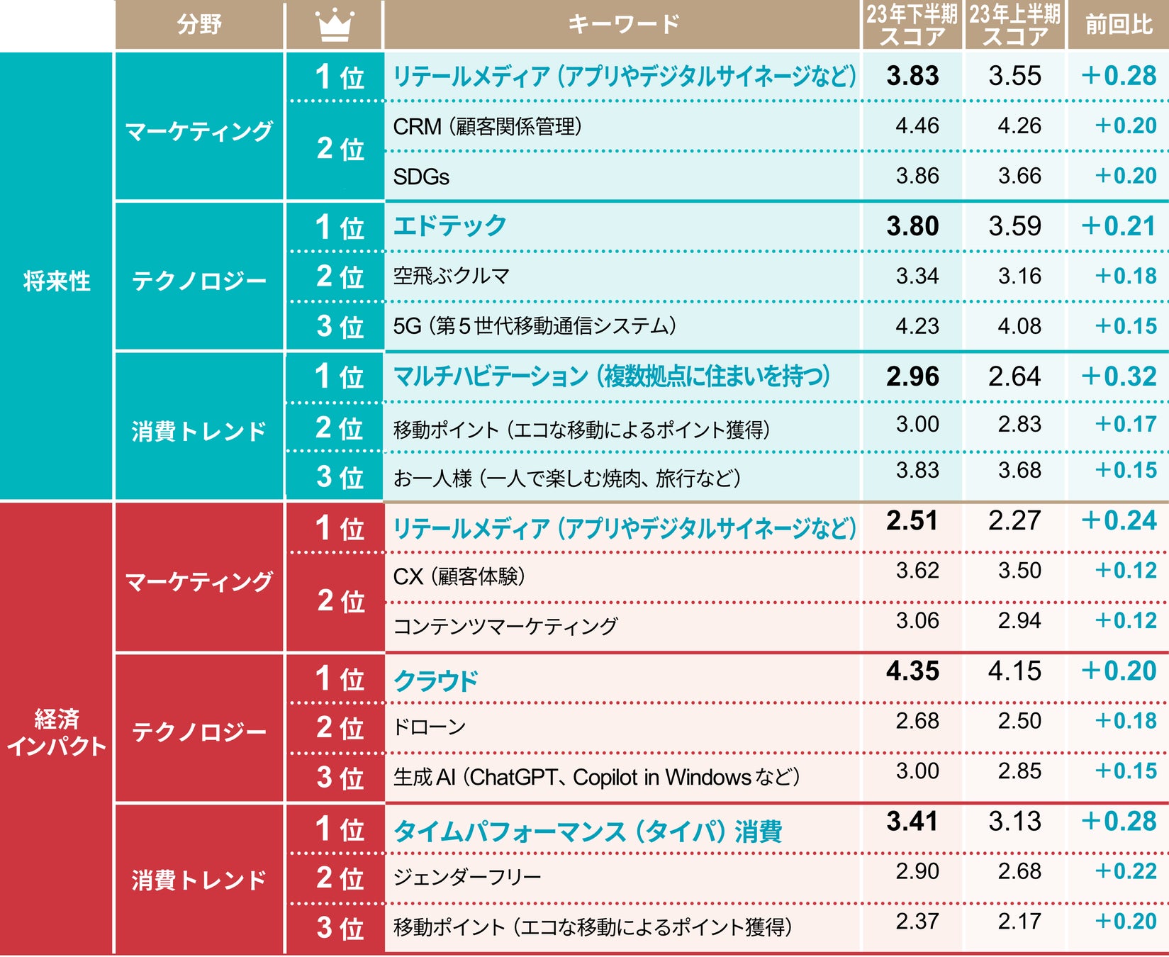 一方、経済インパクトは、全体でスコア上昇率トップだったのは消費トレンド分野の「タイムパフォーマンス(タイパ)消費」でした。そのほかのジャンルについては、マーケティング分野では「リテールメディア(アプリやデジタルサイネージなど)」、テクノロジー分野では「クラウド」、がそれぞれで高い伸びを示しました。