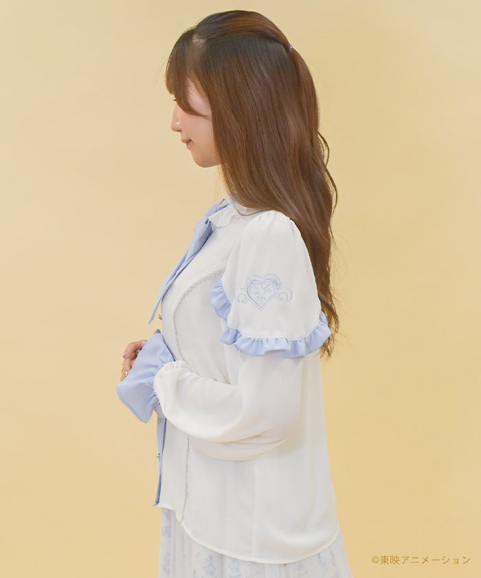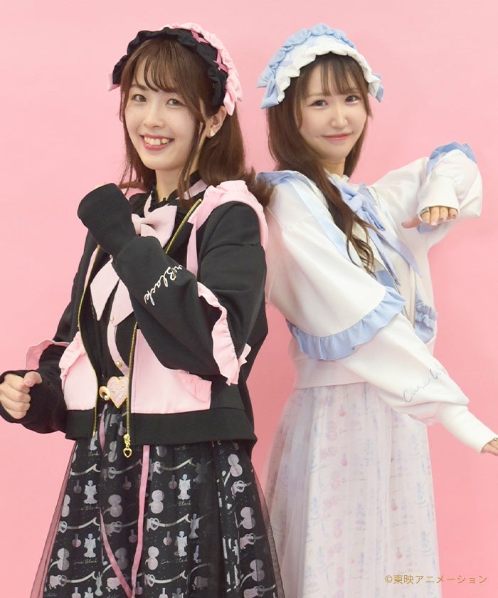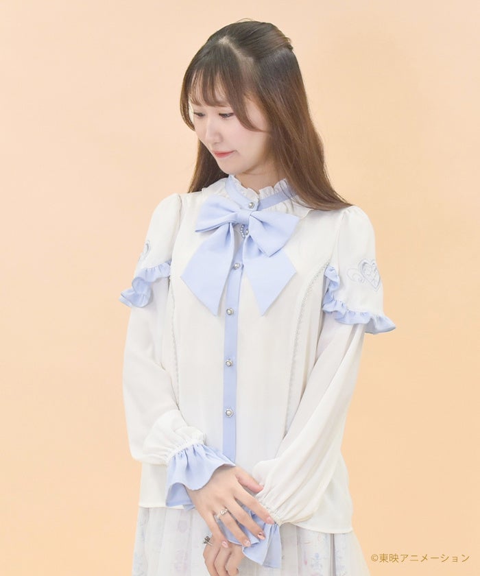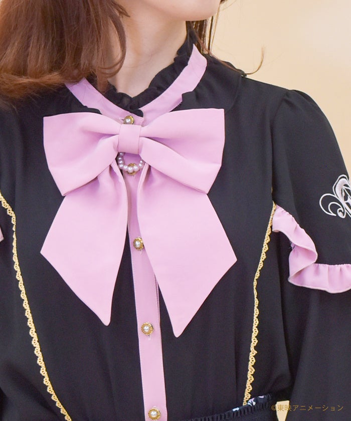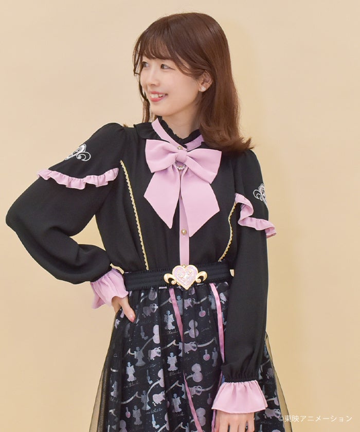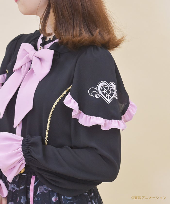 黒×ピンクの配色でキュアブラックを、白×水色の配色でキュアホワイトをイメージしたブラウス。胸元の大きいリボンブローチが、ふたりはプリキュアを連想させるデザイン。
