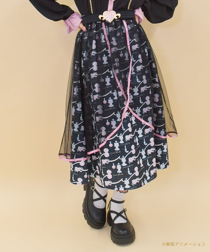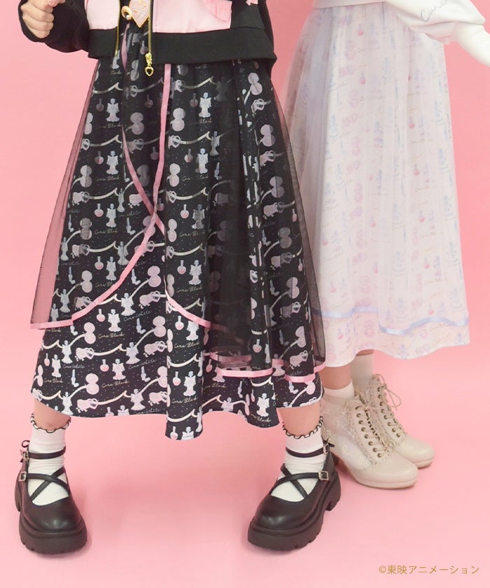 黒×ピンクの配色でキュアブラックを、白×水色の配色でキュアホワイトをイメージしたスカート。かわいらしいコスメモチーフのプリントに、チュールを重ね配色のパイピングをあしらいました。
