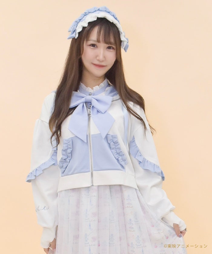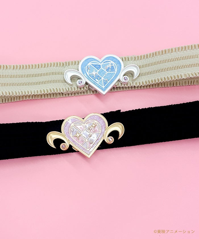 パーカーと生地を連動し、一緒に合わせたくなるアイテム。クリップ式で付けやすく、着用時も外れにくい仕様。レースアップやリボン、ハートのキラキラチャームでプリキュアのようなかわいらしさを表現しました。