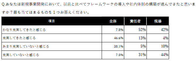 - 新規事業が充実していない理由は「フレームワークがない」「自社のみでの限界を感じる」「人材(スキル)不足」、一方で外部との連携やノウハウの蓄積により充実していると考える担当者も半数以上。