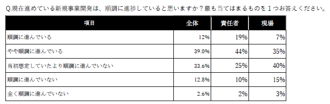 - 責任者と現場メンバーで乖離が生じるプロジェクトの進捗の認識。現場の約半数がプロジェクトの成功を見据えられずに不安を抱いている。特に、より現場に近いメンバーになるほど、その意識は強くなる。
