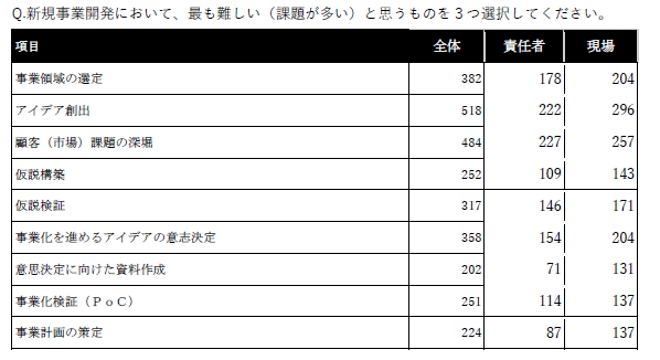 - 実施フェーズで抱える課題の一位はアイデア創出、二位は顧客課題の深堀、三位は事業領域の選定