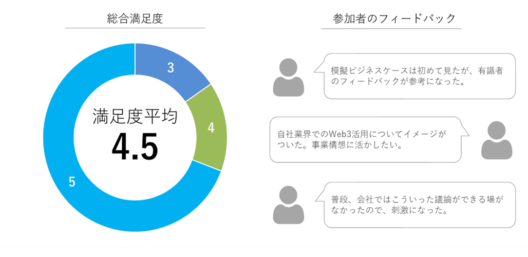 我々は、上記コンセプトの実証のため、11月29日にWeb3領域をテーマとしたイベントを開催し、成功を収めました。多くの大企業やベンチャー企業の皆様に参画いただき、イベント全体で高い満足度を得られたほか、議論も非常に活発に行われ、参加者の皆様に価値を感じていただいたというお声も多くいただきました。