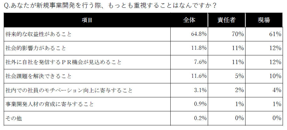 - 新規事業担当者が重視する点第1位は将来的な収益性、2位は社会的影響、3位は社会課題の解 決。特に、経営者層は現場メンバーに比べ、10%以上収益性を重視している。