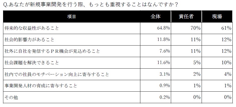 ・新規事業担当者が重視する点第1位は将来的な収益性、2位は社会的影響、3位は社会課題の解決。特に、経営者層は現場メンバーに比べ、10%以上収益性を重視している。
