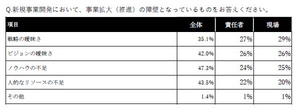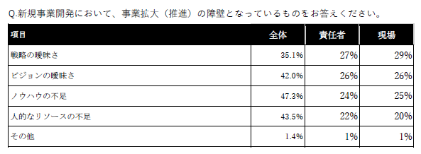 - 担当者の4割以上がノウハウ不足、人的リソースの不足、ビジョンの曖昧さを障壁と感じており、複合的な要因で事業化に繋がりづらい現状となっている。