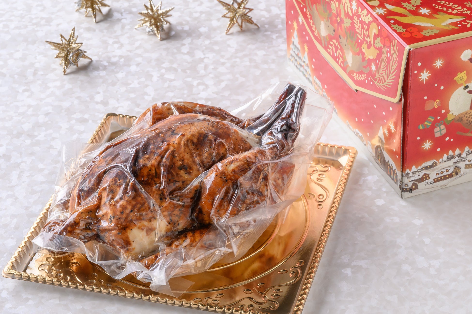 柔らかくジューシーな丸鶏に、ガーリックライスを詰めてオーブンでじっくり焼き上げました。皮目はこんがり香ばしく、丸鶏の中は肉とガーリックライスの旨味をギュっと凝縮させています。また、あらかじめ、骨を抜いてローストをしてあるので、手が汚れることなく、取り分けもスムーズです。真空した状態でのお渡しとなりますので、お持ち帰りもご安心いただけます。