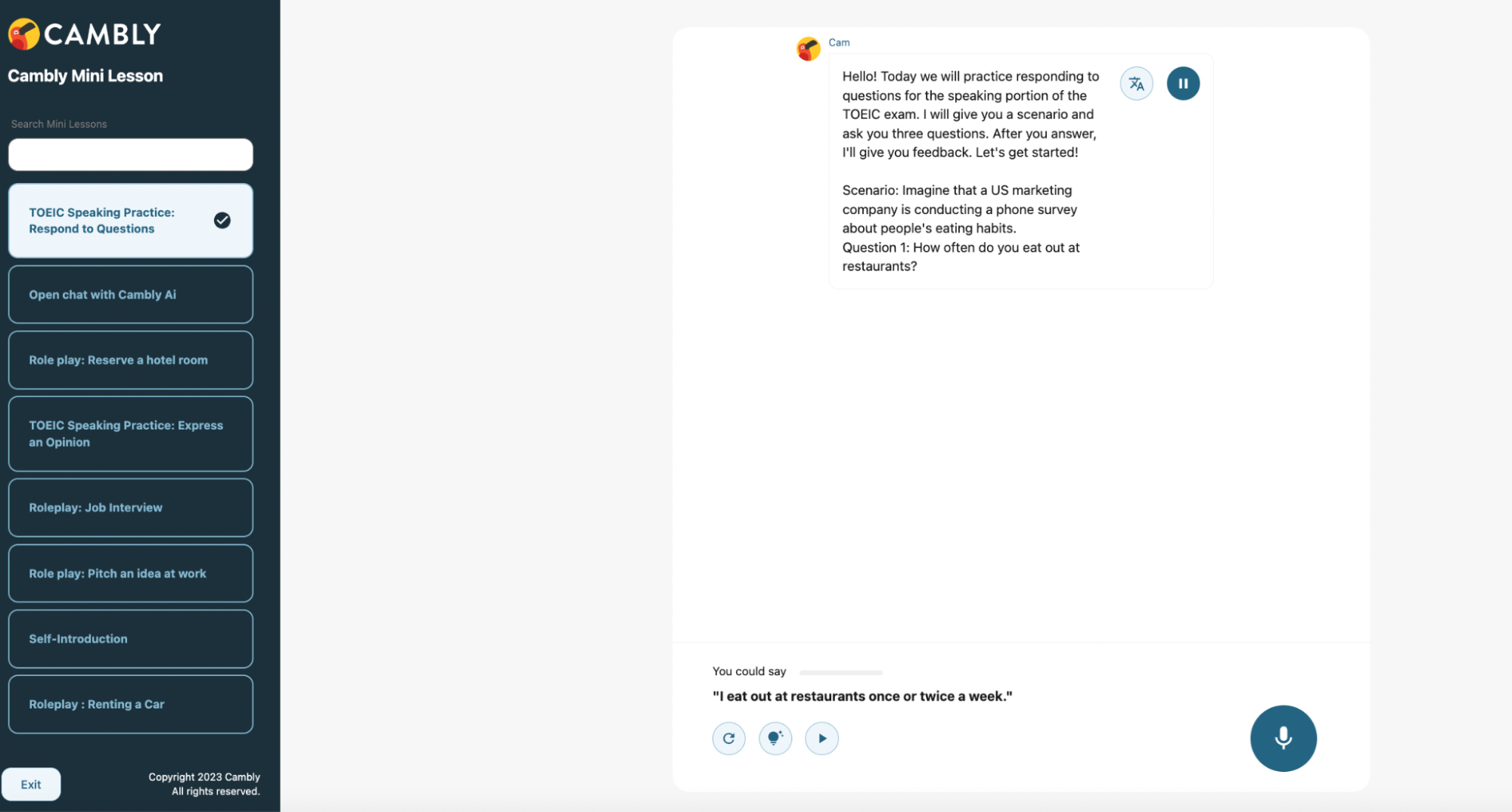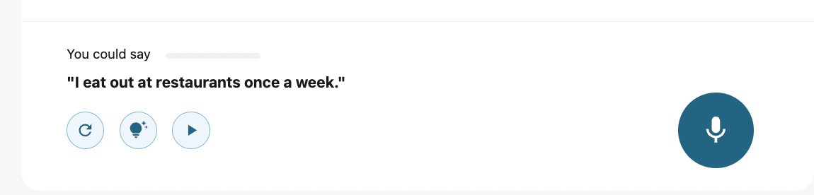 Cambly AIではAIとの会話に対する回答の例文が左下に表示されます。一番左の矢印マークをクリックいただくと、別の回答例が表示されるので自分の答えに近いものを探していただくことが可能です。例文の発音を確認し、正しい発音を真似て英語を話す練習ができます。