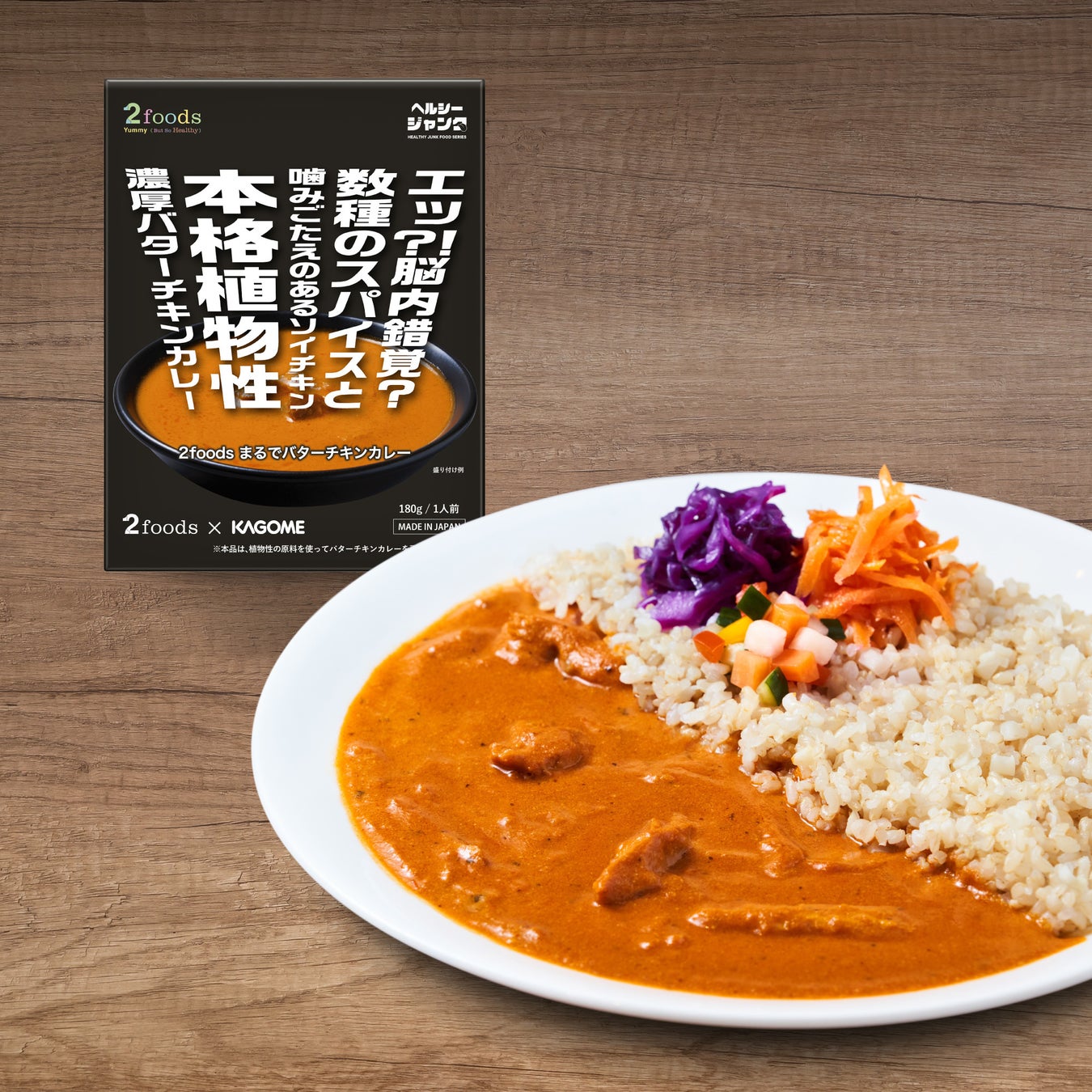 2 種の特徴は野菜をたっぷり使っていること。「2foods オリジナルカレー」には野菜 200g 分※4、「ま るでバターチキンカレー」には 150g 分※4 をふんだんに使用しました。プラントベースでありながら本 格的なカレーのコクや香りなどを楽しめる、こだわりの商品です。