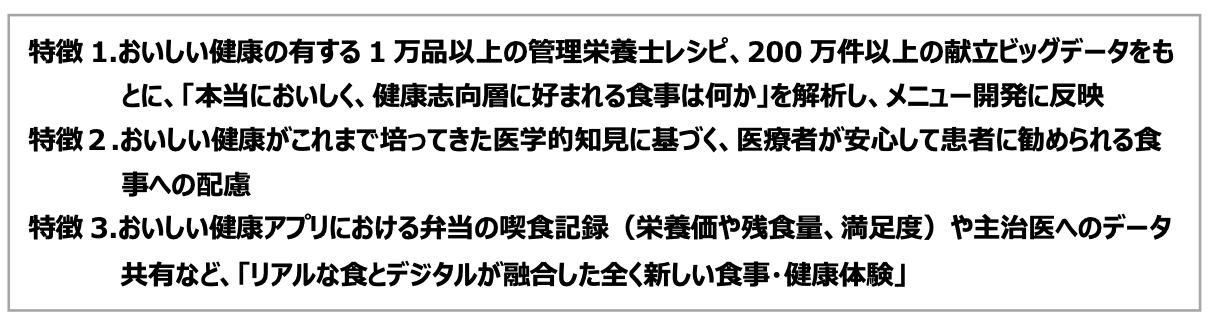 その一方で、「料理が苦手な方」や「勤務先の昼食」といったシーン、あるいは「疲れていて、時には家事や料理を休みたい」といった状況において、おいしい健康アプリは必ずしも便利なサービスと言えず、多くの方々より「料理しない時でも、おいしく健康的に食べられる食事が欲しい」という声を頂いておりました。そのような中、宅食を含む外食事業において豊富な知見と運営体制を有するワタミとともに、「おいしさ」と「健康」に加えて「料理の手間いらず」を兼ね備えた調理済み宅配弁当の共同開発に着手いたしました。