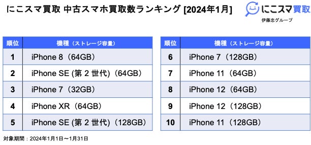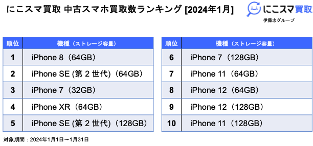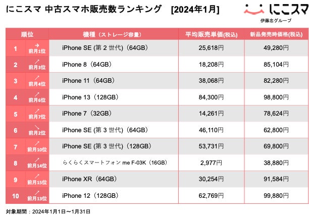 にこスマ|2024年1月中古スマホ販売・買取数ランキング