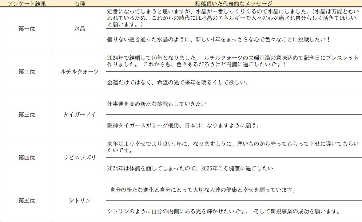 アンケートで多かった上位石種と、頂いた主なメッセージは下記になります。