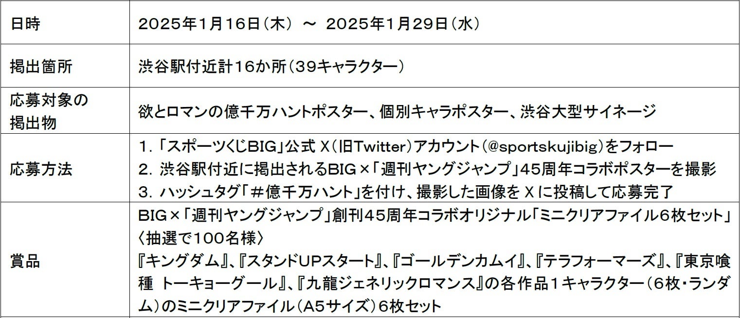 2025年1月16日(木) ~ 2025年1月29日(水)の期間で、「週刊ヤングジャンプ」人気キャラクター39人が渋谷の街をジャック。渋谷駅周辺に掲出されたBIG×「週刊ヤングジャンプ」45周年コラボポスターを撮影して指定ハッシュタグと共にX(旧Twitter)でシェアした方の中から抽選でBIG×「週刊ヤングジャンプ」創刊45周年コラボオリジナル「ミニクリアファイル6枚セット」をプレゼントします。