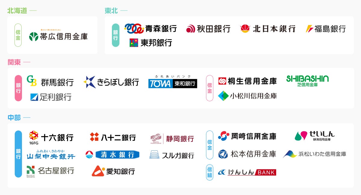 芝信用金庫、帯広信用金庫、岡崎信用金庫、北伊勢上野信用金庫、静清信用金庫、大阪商工信用金庫、松本信用金庫、玉島信用金庫