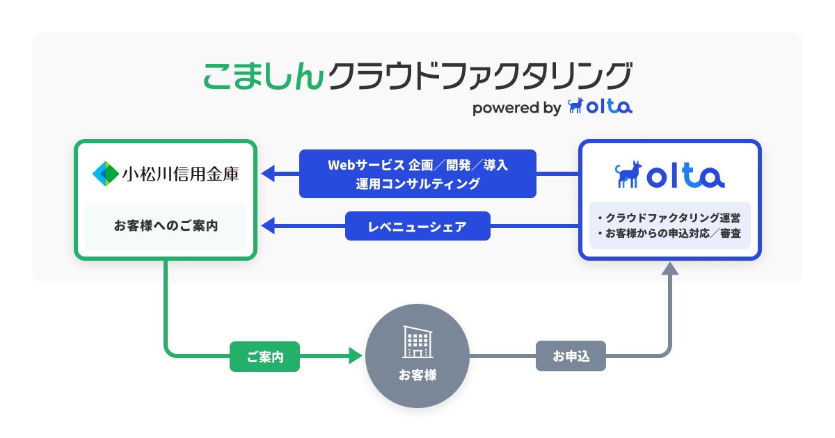 OLTAと小松川信用金庫とのクラウドファクタリング事業における提携では、OLTAがWebサービスの企画・開発・導入および運用におけるコンサルティングを小松川信用金庫に提供し、小松川信用金庫は法人・個人事業主のお客様にサービスをご案内します。