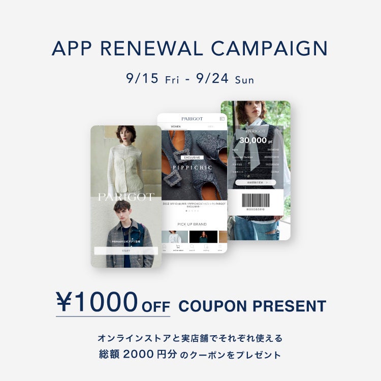 パリゴ公式アプリのリニューアルを記念し、オンラインストアと各店舗でそれぞれご利用いただける1,000円クーポンを合計2枚プレゼント。