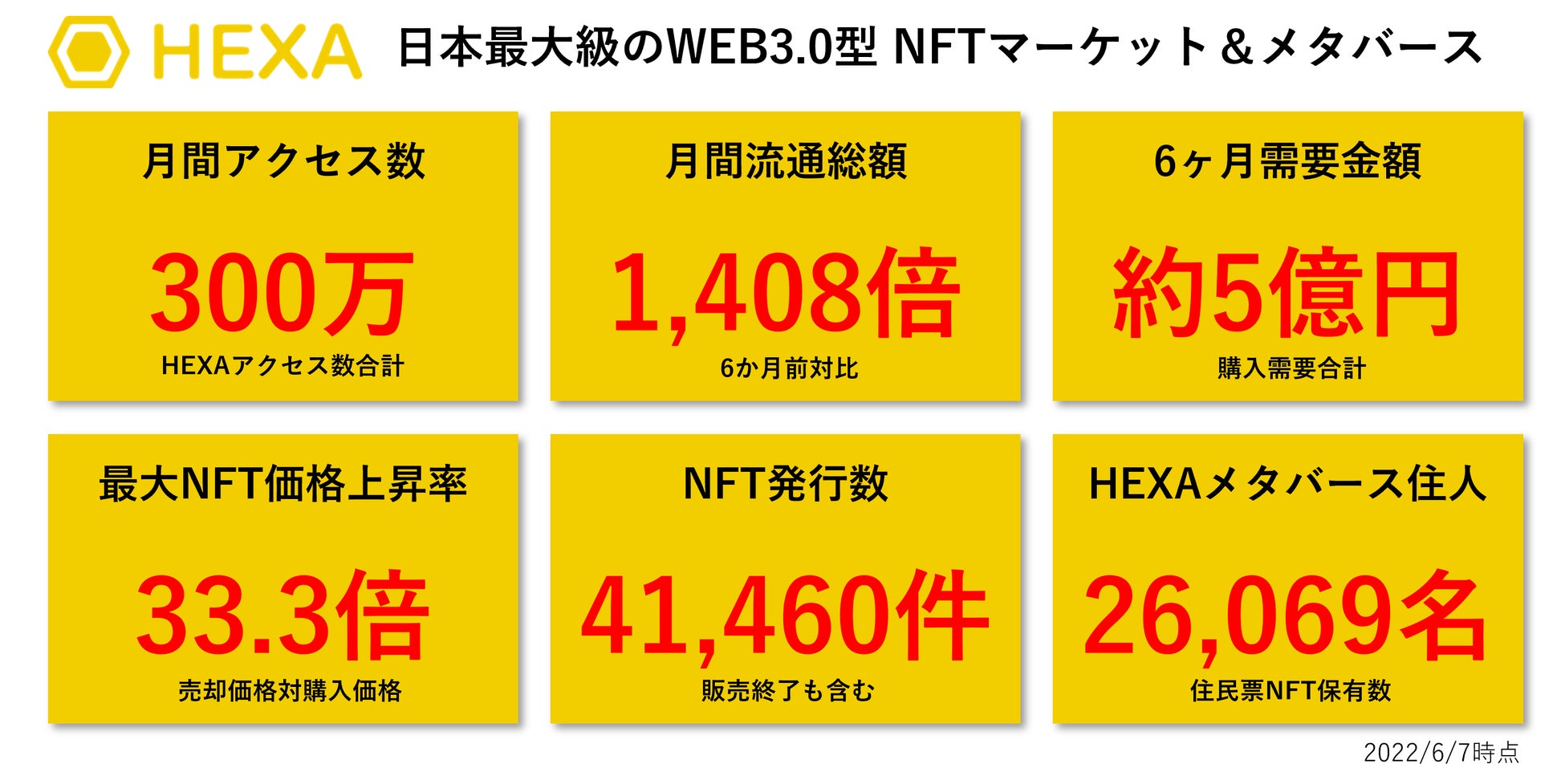 日本最大級のNFTマーケット&メタバースのHEXA(ヘキサ)は、月間のアクセス数が300万アクセスを突破したことを記念し、メタバース住人数や取引高の増加率などの情報を公開しました。