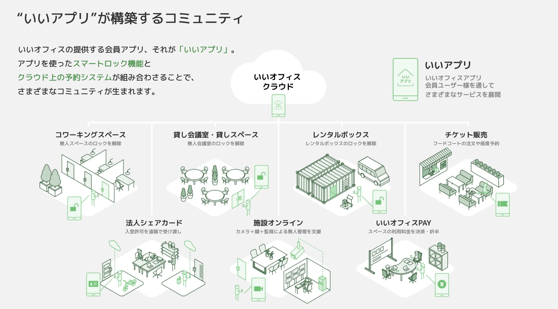 また、解錠と決済を一元化することで、コワーキングやレンタルスペースなど場所に関わるサービスだけではなく、シェアサイクルやカーシェアリングなど、鍵と決済にまつわるあらゆるサービスが「いいアプリ」で連携可能になります。