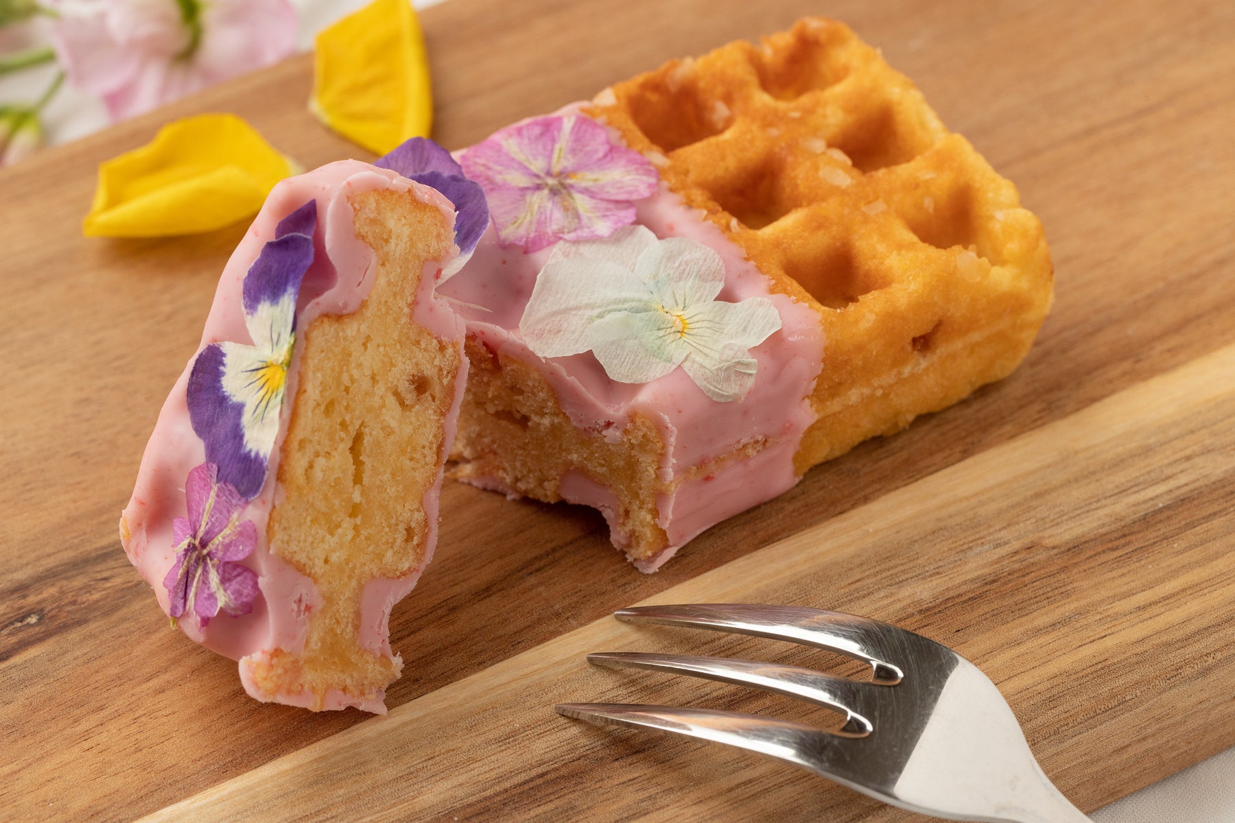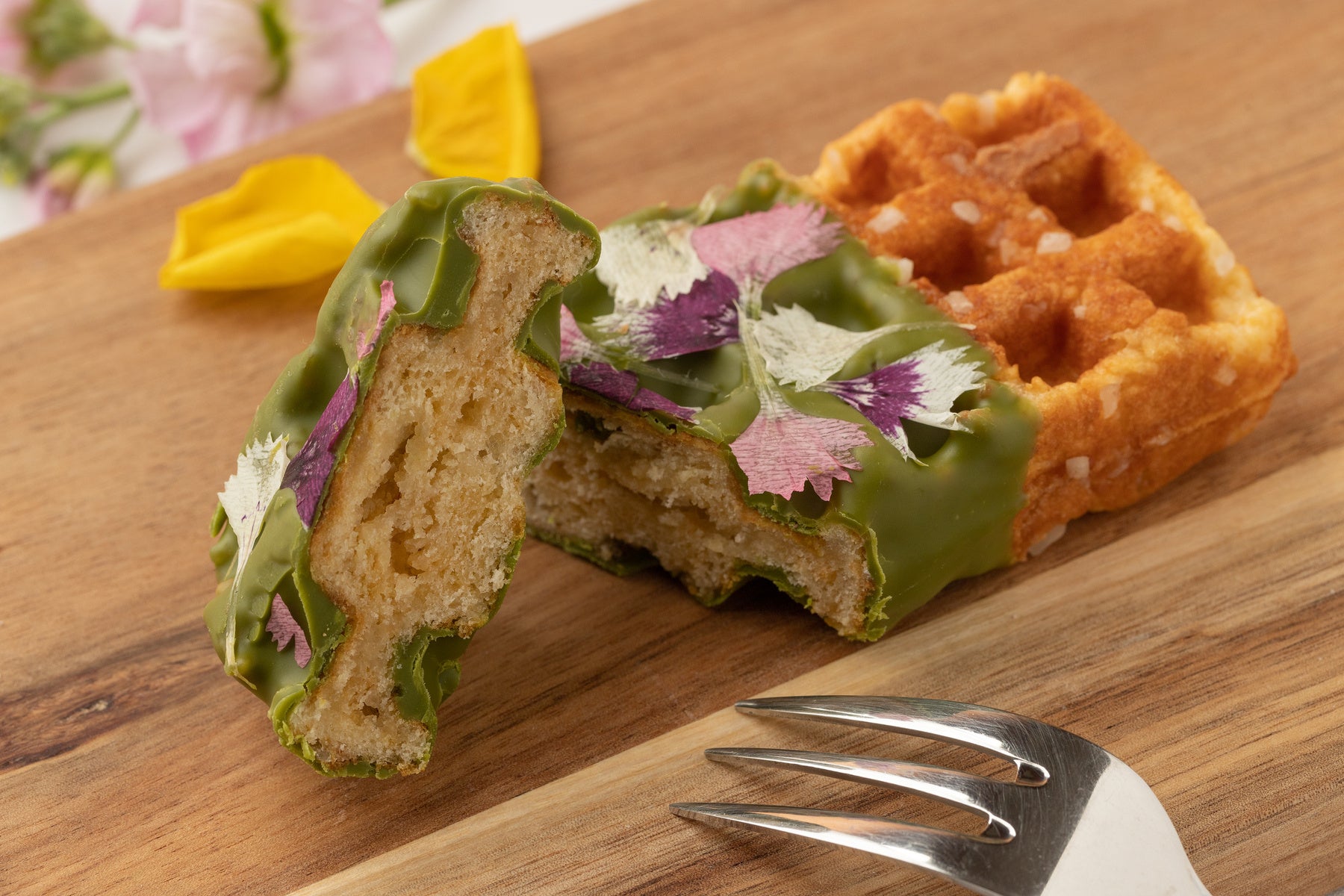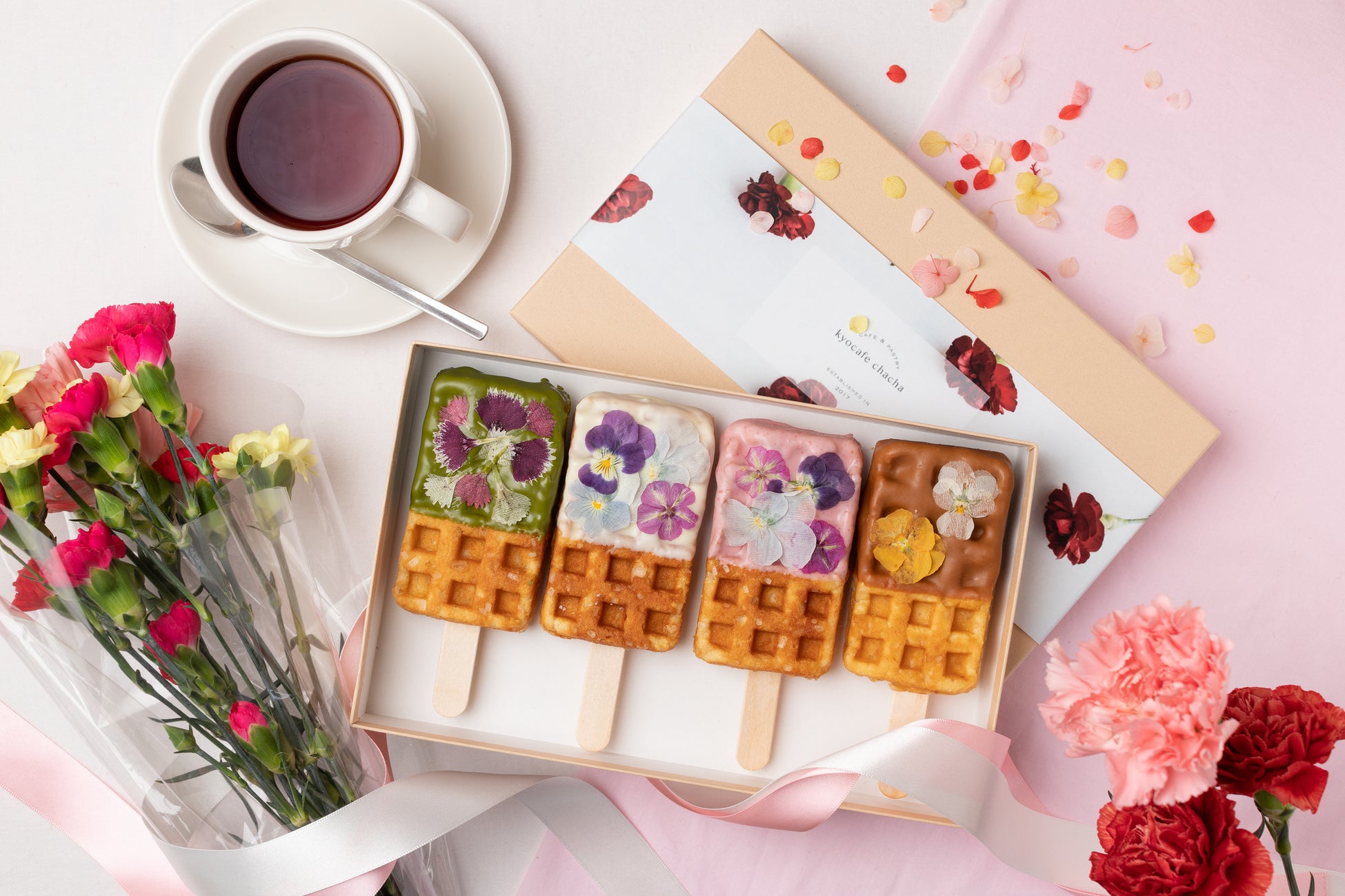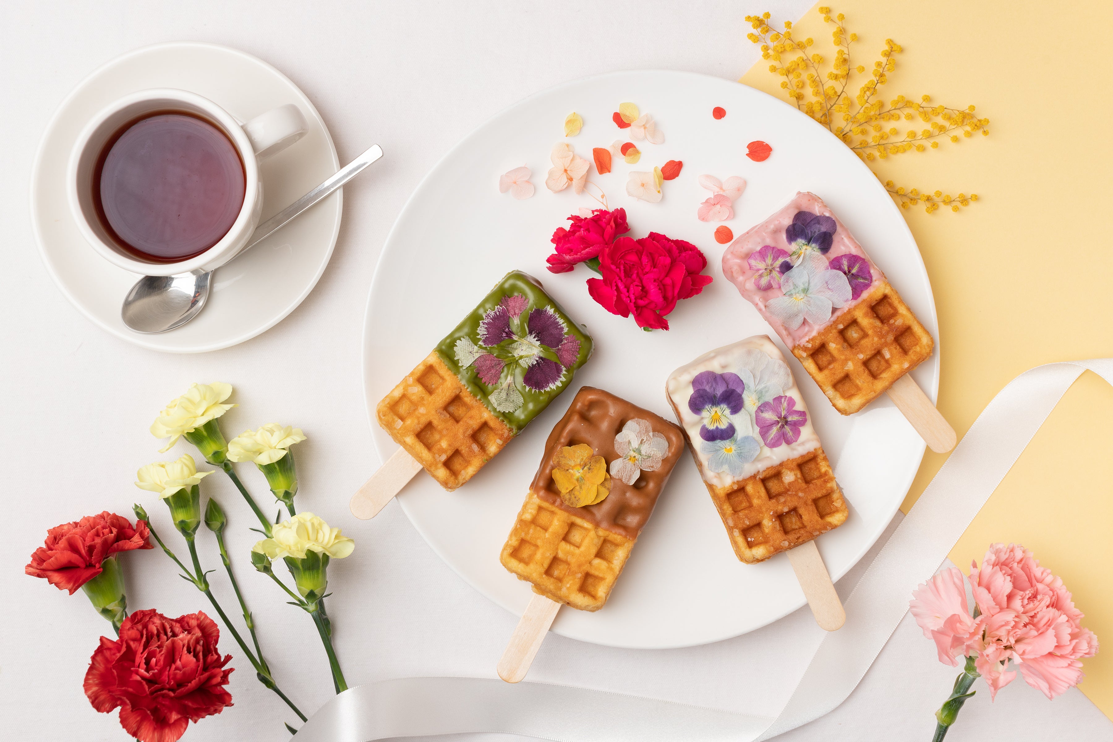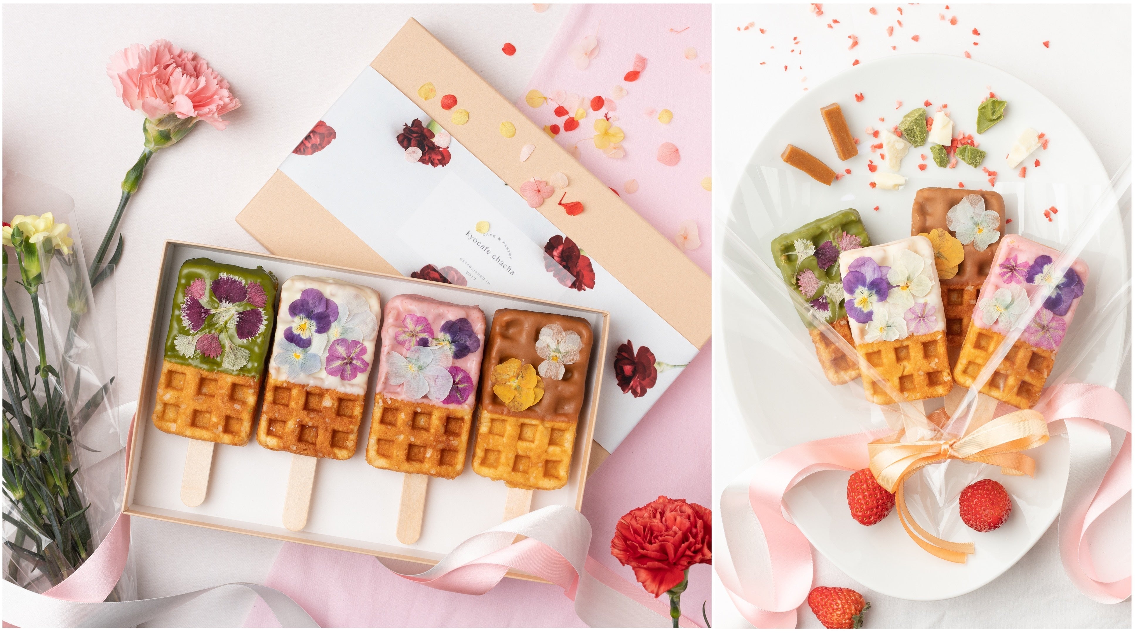 ワッフルにあしらわれたエディブルフラワーは、それぞれのチョコレートの色味に最もマッチした色と形のものを厳選。1枚1枚手作業で、バランスを見ながら丁寧にトッピングし、華やかで上品なビジュアルに仕上げております。