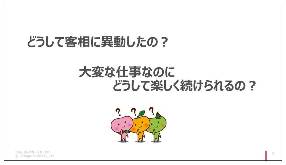 春日井製菓・お客様相談室の山口(仮名)は、グミ工場で5年間勤務した後、社内公募でお客様相談室に異動希望を提出しました。これまで多くのお客様対応をしてきた経験から「この仕事は、私にぴったりです。」と語ります。そんな担当者からは、どんな会社でも、どんな仕事でも応用できる3つの秘訣を発表しました。