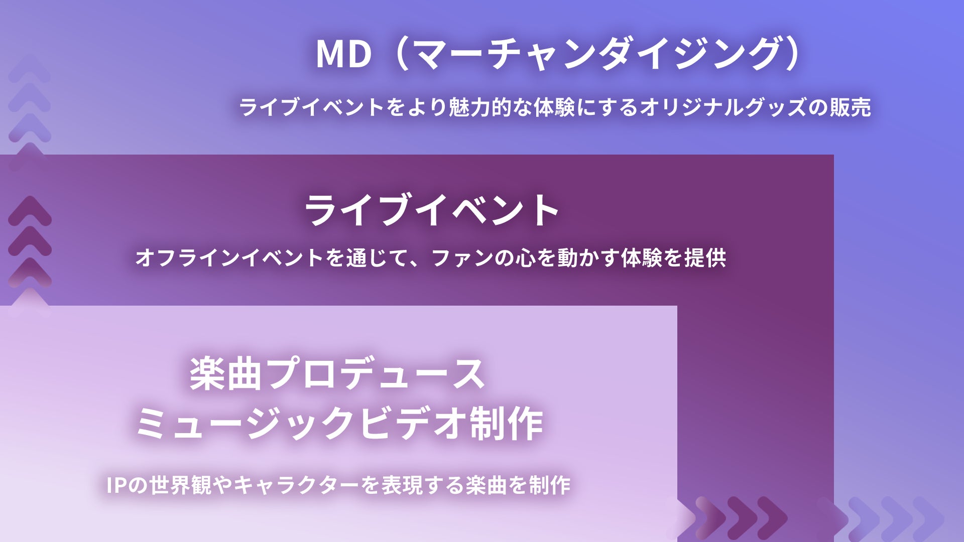 これらの実績を通じ、IPを起点にした音楽コンテンツが多くのファンに強く支持されていることを実感し、さらなる可能性を追求するために音楽レーベル「Plott Music」の設立及び本格的な音楽市場への参入に至りました。「Plott Music」では、楽曲プロデュースやミュージックビデオの制作だけでなく、ライブイベントの運営及びオリジナルグッズの制作、販売にも注力してまいります。