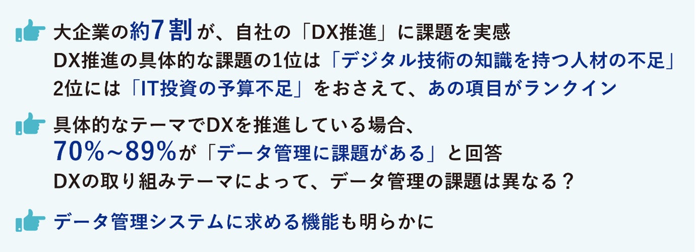 本調査では、大企業のデータ管理の実態と課題を明らかにし、DXを進めるためにはどのような対応が必要かを紐ときます。
