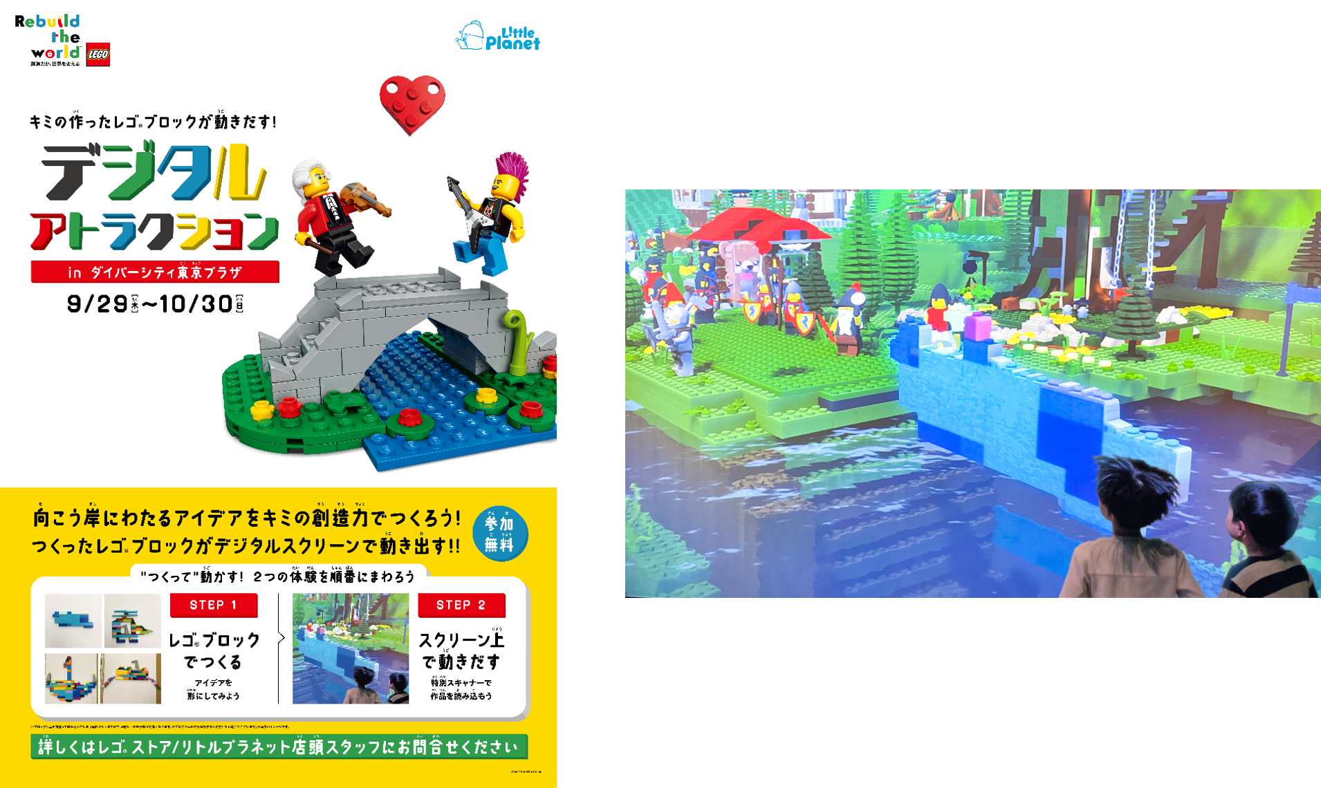 次世代型テーマパーク「リトルプラネット」(https://litpla.com)との初のコラボレーションにより、自分で作ったレゴ®ブロックがスクリーン上で動き出すアトラクション「キミの作ったレゴ®ブロックが動きだす ! デジタルアトラクション」を実施します。