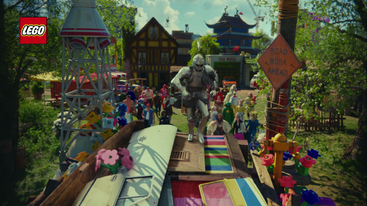 子どもが部屋で鎧を身にまとった騎士のミニフィギュアとレゴ®ブロックで遊んでいます。すると、鎧を身にまとった騎士のミニフィギュアがリアルな騎士となり子どもたちの創造の世界が動き出します。騎士は、川を小舟で渡ろうとしたり、大きなパチンコで向こう岸に辿りつこうとしたりするものの失敗続きです。諦めず何度も挑戦する騎士の姿をみて集まった仲間たちと協力して架け橋が完成。今度こそ渡り切るか、と思った矢先に再度崩れ落ちてしまいます。その時、場面は子どもたちが遊んでいる部屋へ戻り、実は崩れた橋はレゴ®ブロックで作っていたことが判明。子どもたちが協力してレゴ®ブロックで橋を作り直し、ついに騎士は川を渡りきり、友達のクマのもとへ辿り着くことができました。